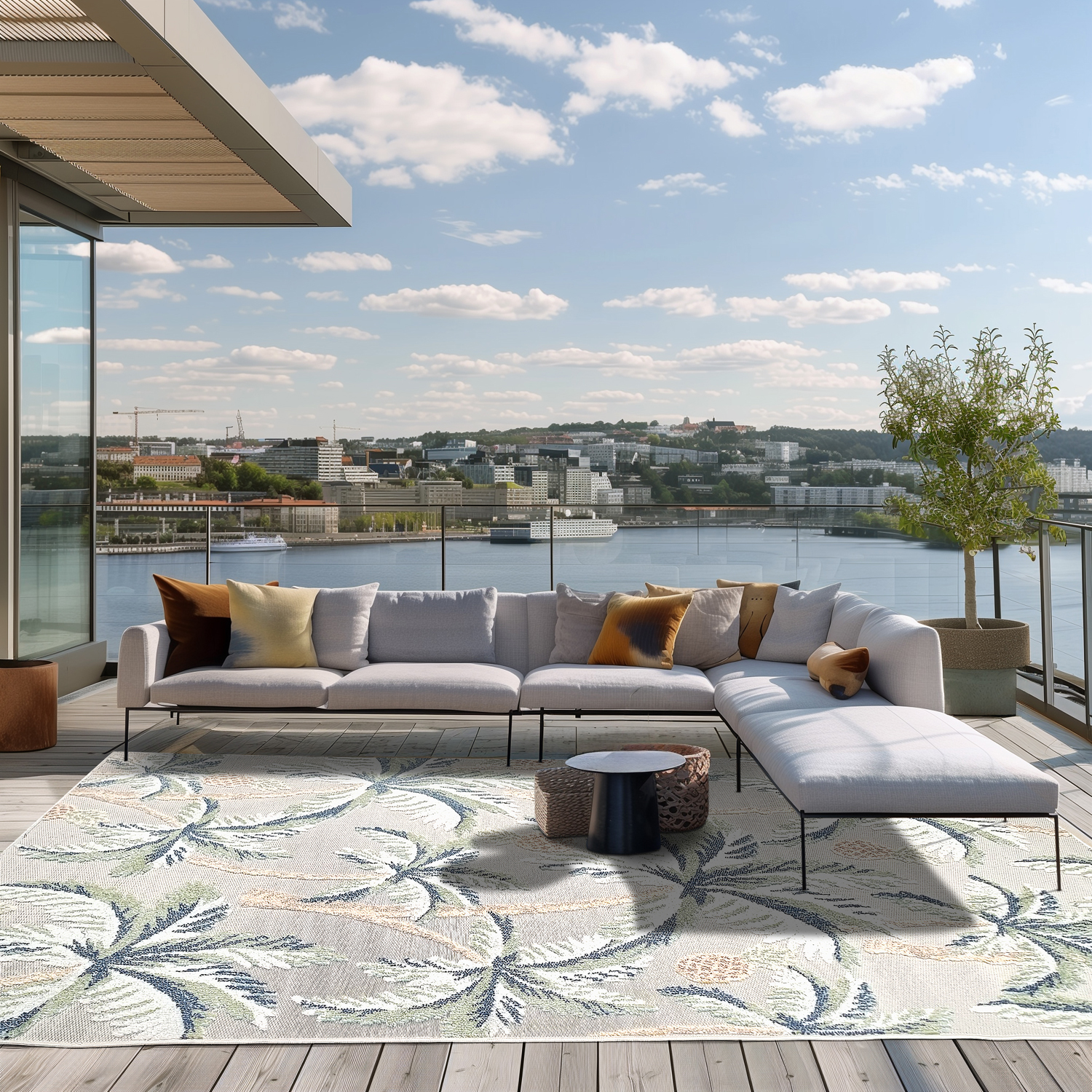 Gedessineerd vloerkleed, geschikt voor zowel binnen als buiten.