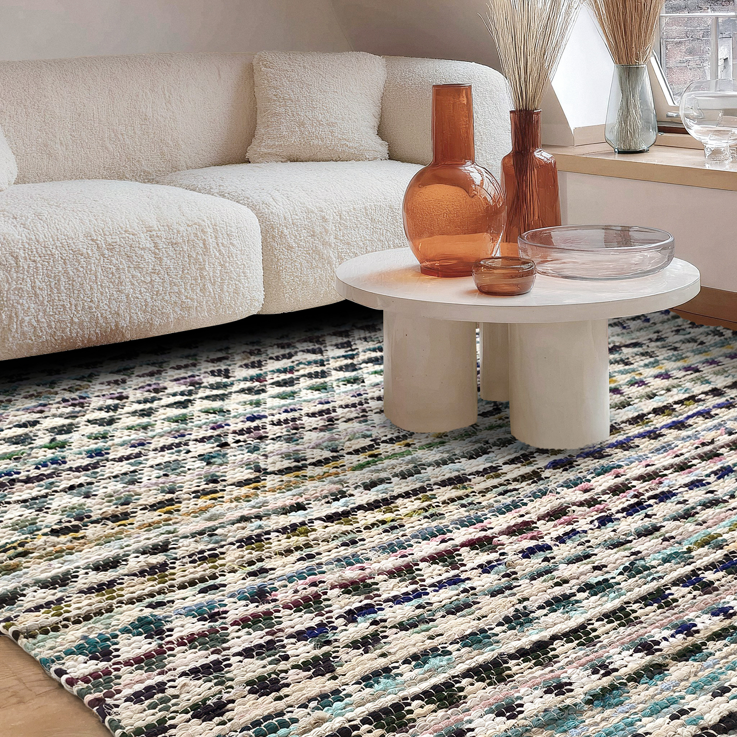 Klassiek lapjestapijt in huiselijke kleuren die een warme en uitnodigende sfeer creëren. Dankzij het duurzame en onderhoudsvriendelijke materiaal is het ideaal voor in de hal of keuken – waar stijl en functionaliteit in het dagelijks leven samenkomen.