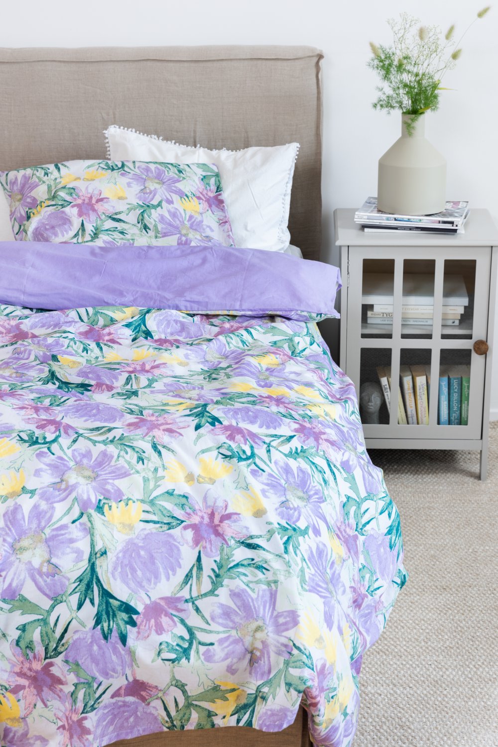 Het dekbedovertrek heeft aan de ene kant een patroon en is aan de andere kant effen van kleur, voor twee unieke looks in één. Er zijn openingen in de bovenhoeken om het dekbedovertrek gemakkelijk over het dekbed te kunnen doen.