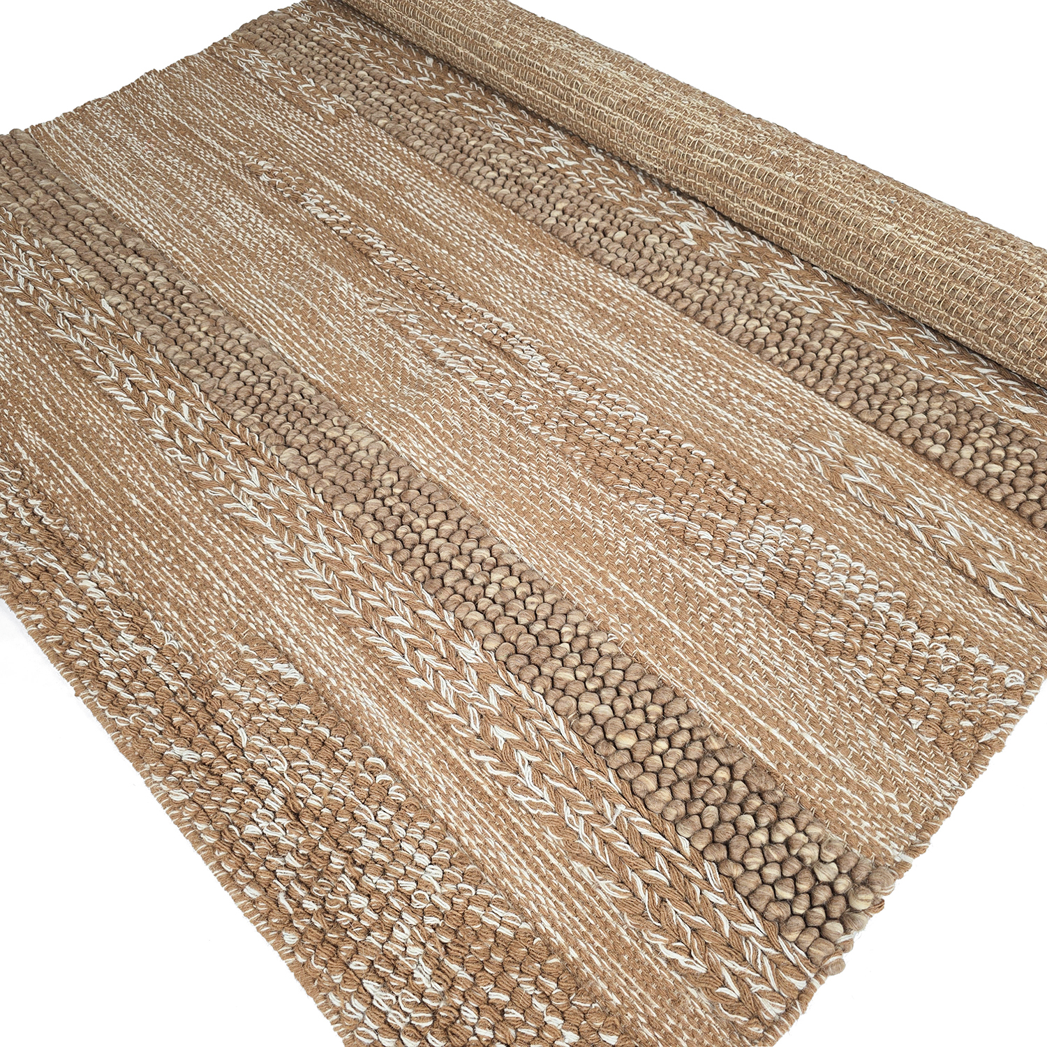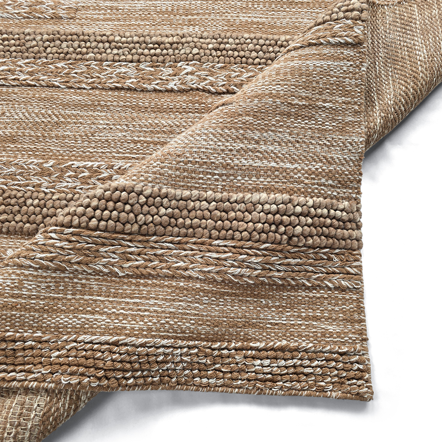 Wollen vloerkleed met een patroon dat subtiel naar voren komt door variaties in weeftechniek. Elke sectie is handgeweven met verschillende structuren die licht en schaduw op unieke manieren vangen. Het resultaat is een tijdloos kleed met een tactiele uitstraling en artistiek karakter – perfect voor wie op zoek is naar een modern maar harmonieus interieurelement.
